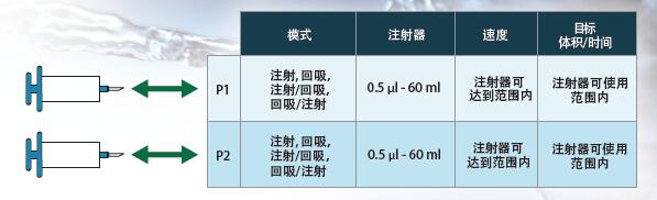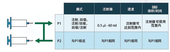 在往复运行方式下, 两个通道使用相同的尺寸和类型的注射器以同样的速度向相反的方向运行。当与阀门箱同时使用时,往复方式可以提供像蠕动泵一样的连续流体输送,并且比蠕动泵更加准确,没有蠕动脉冲,同时可以提供更加低速的输送速度。