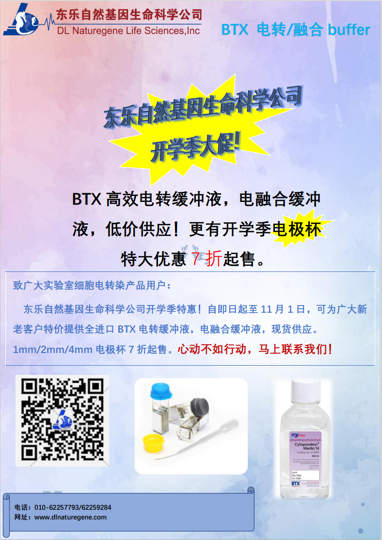 为感谢广大客户长期以来对东乐自然基因生命科学公司的支持,值此新学期开学之际,我公司特推出BTX电转染产品促销活动,以便更好的服务于广大实验室细胞电转染产品用户。