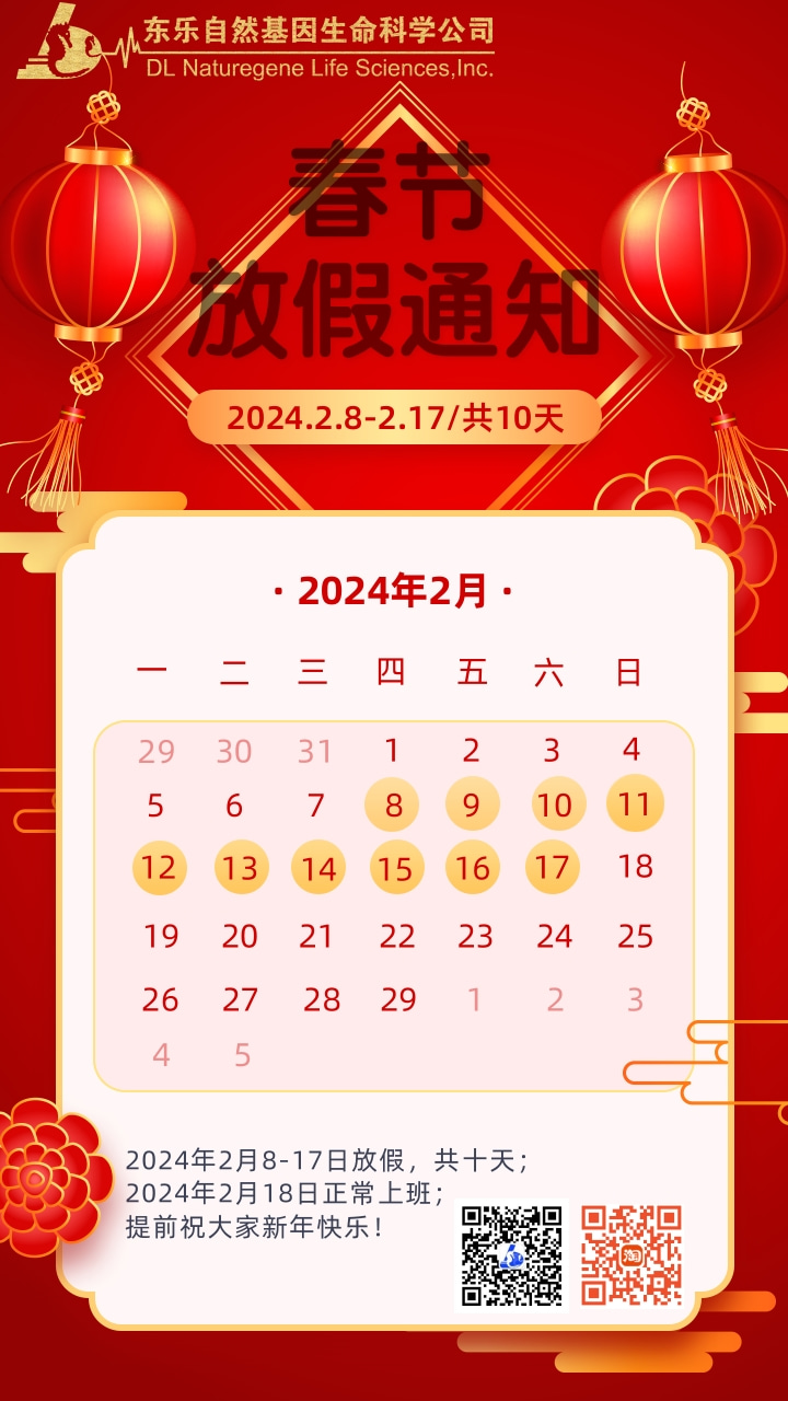 春节放假期间如有问题您可留言至info@dlnaturegene.com,我们将在复工后及时为您处理。